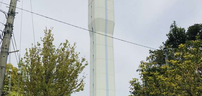 Mukoudai Public Residence Water Tower@Mukou City – Kyoto / 京都府向日市向台団地 給水塔 by nabenabe on April 28, 2019August 30, 2020 in 30~50t, Elevated Water Tank / 高架水槽型, Kyoto / 京都, Modern Metal Style/ モダン金属構造, Mukou City / 向日市, Multi-columns Elevated / 多層階層形状, Water Tower / 給水塔